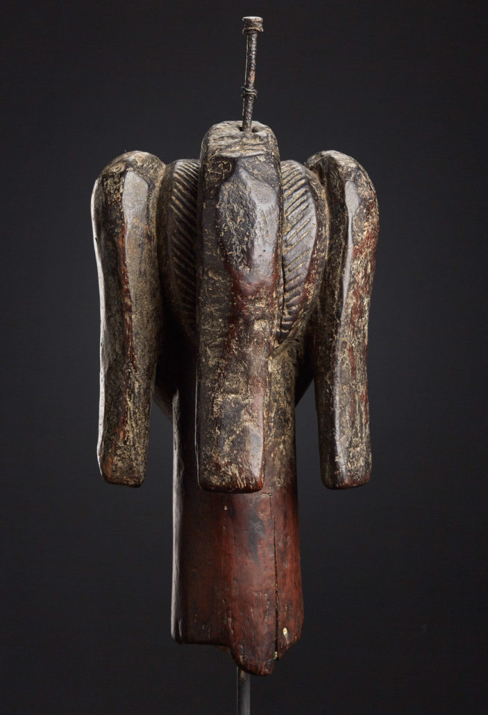 The Fang head in this collection features striking characteristics in form and craft with some of the most iconic Fang heads known today. Three evenly spaced tresses of hair extended as broad bands back and away from the head. If watched from the front the face is framed by the outer two, while seen from the side they evoke undulating ribbons that instill this solid form with an ethereal quality that reminds us of the fang head once owned by Helena Rubinstein (excerpt from „Eternal Ancestors – the art of the central african reliquary“, museum of modern art, page 204).